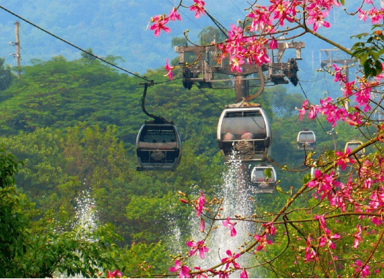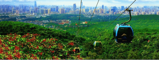 白云山索道下起白云山南麓云台花园东侧,上至白云山山顶广场,于 1986 年建成运营,水平长度 1617 米、高差198 米。白云山索道是我国第一条自行设计和建造的单线循环、 双钳口抱索器的旅游观光索道,是广州第一条为登山游览服 务建设的驾空索道。白云山索道于 2004 年全面改造,全套 设备从奥地利多贝玛亚公司引进,年运送游客达 190 万人次。