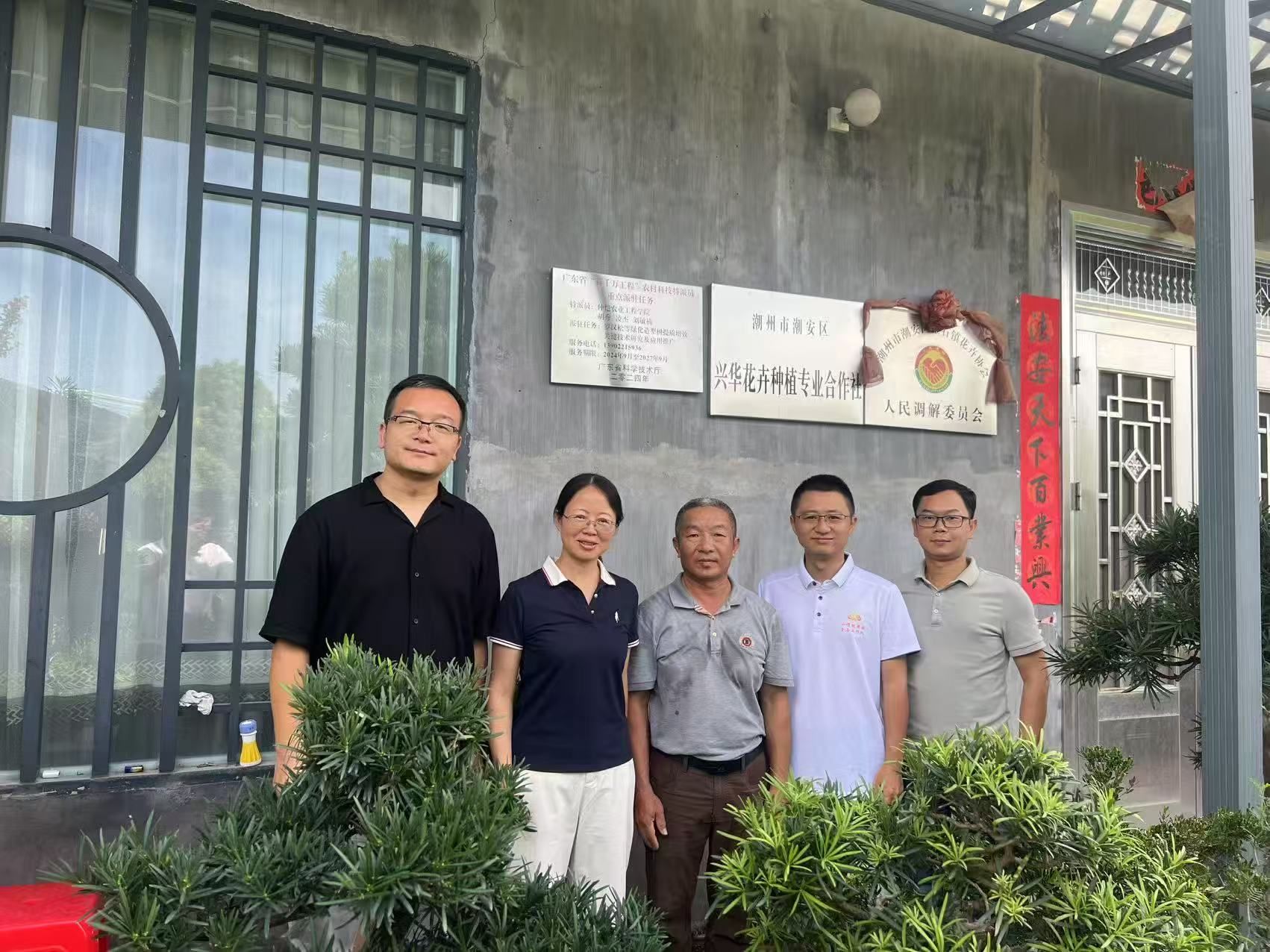 7月2日,团队一行前往金石镇翁厝村锦艺园花木场调研。在金石镇花卉协会会长翁勇金、中山市驻金石镇“乡村振兴”工作队队长周涛、金石镇党委委员方培钿及相关工作人员的见证下,举行了广东省“百千万工程”农村科技特派员重点派驻任务牌匾挂牌仪式。随后,胡秀教授实地查看了前期罗汉松杂交试验植株的生长情况并提出改进措施,以期培育出更具观赏价值和生态价值的罗汉松新品种。为进一步助力金石镇花卉产业提质增效,胡秀教授向园区赠送了矮化盆栽姜花品种“巧巧姜花”,并提供了相应的栽培技术方案,重点就基质配比、补光处理、生长调节剂使用注意事项进行详细讲解。同时,结合金石花卉发展现状,拟引进朱顶红新品种,通过增加花卉品种,拓宽市场销售渠道。