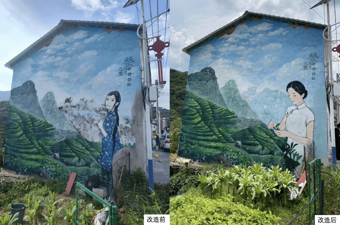 绘新颜,美环境——团队结合良田乡本土自然特色与农耕文化,精心绘制了三幅大型主题墙绘,并对原有“采茶姑娘”墙绘进行了修复提升。通过主题墙绘望展现良田乡历史底蕴与乡村美好生活愿景,形成传播文明、展现乡风、提升村容村貌的亮丽风景线。