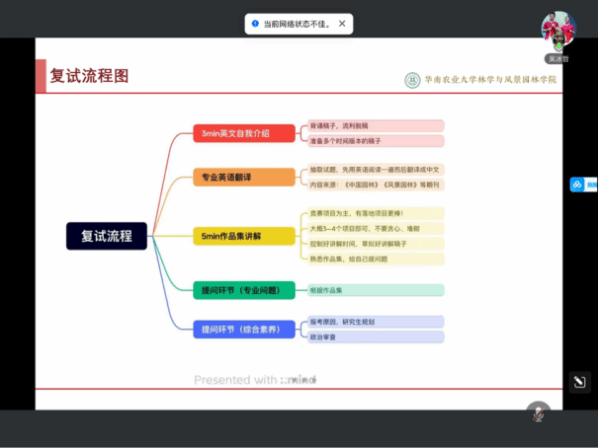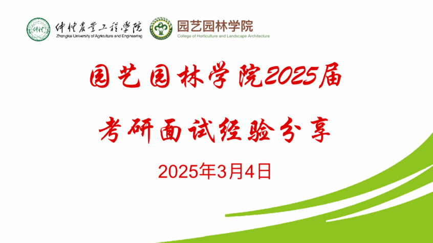 为帮助考研学子更好地备战复试,提升备考信心和技巧,3 月 4日,园艺园林公司举办 “助力研途,决胜复试” 考研复试经验分享交流会,交流会由辅导员黄慧娟主持。活动特别邀请了林涛、杨坤清、吴冰哲、伍泳媚四位在考研复试中表现优异的师兄师姐,为即将参加复试的同学提供宝贵的经验。